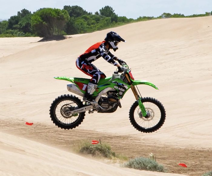 - Posición del cuerpo: Genot manejó casi el 90% del tiempo desplazado hacia el eje trasero, descargando la rueda delantera para que «flote» sobre la arena blanda.