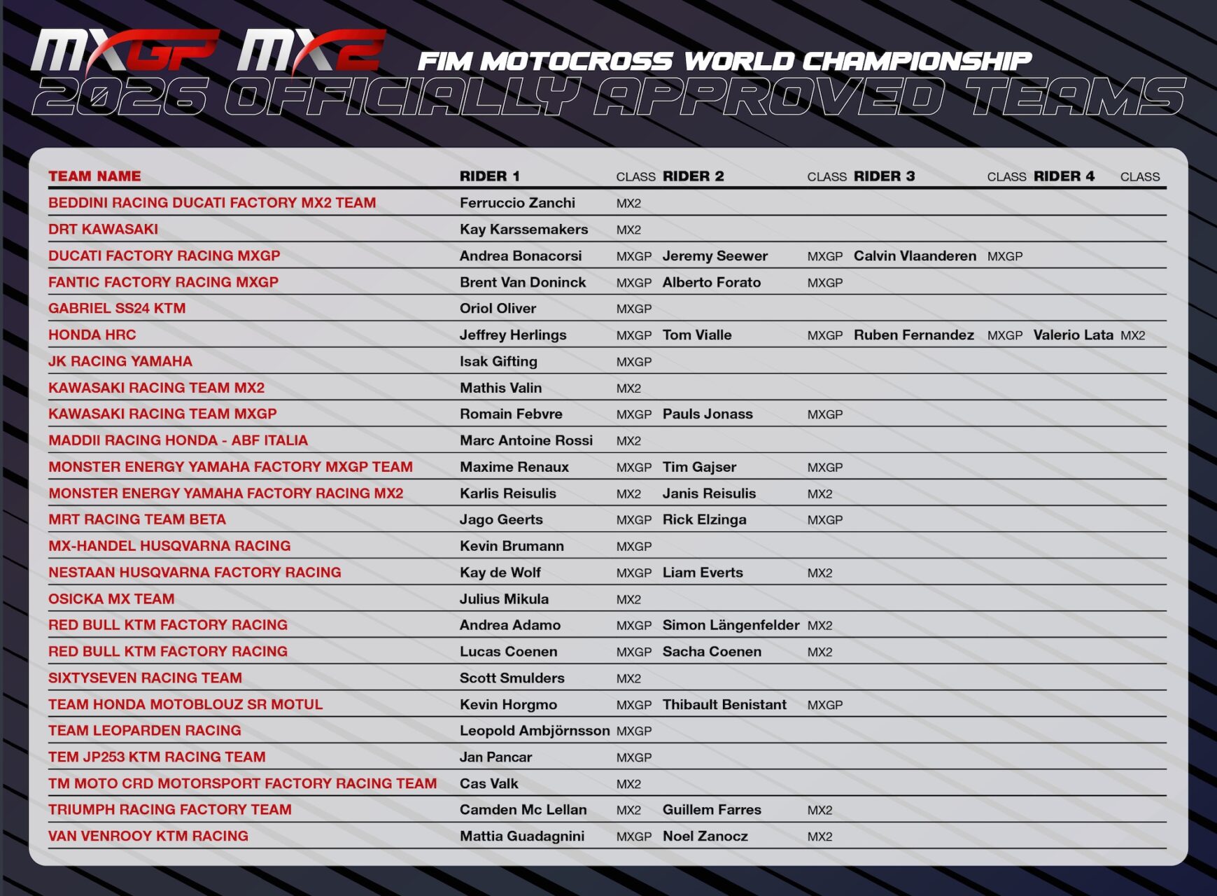 Entre otros movimientos destacados, Calvin Vlaanderen y Andrea Bonacorsi se unen a Ducati Factory Racing MXGP junto a Jeremy Seewer, mientras que Fantic Factory Racing MXGP, ahora bajo la dirección de Jacky Martens, alineará a Brent van Doninck y Alberto Forato. Beta competirá con Jago Geerts y el debutante Rick Elzinga en MRT Racing Team Beta.