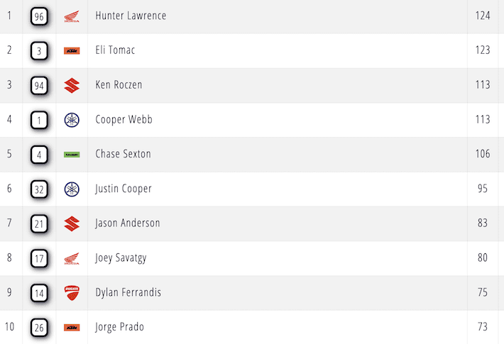 En el campeonato, Deegan suma ya 12 triunfos en su carrera y estiró la ventaja a 35 puntos sobre Anstie antes del receso. Michael Mosiman (6°) y Ryder DiFrancesco (4°) comparten el tercer lugar, a 36 unidades. Kitchen, tras un arranque complicado, ya es quinto y quedó a 42 puntos de la punta, pero a solo siete de Anstie en la pelea por el segundo lugar.